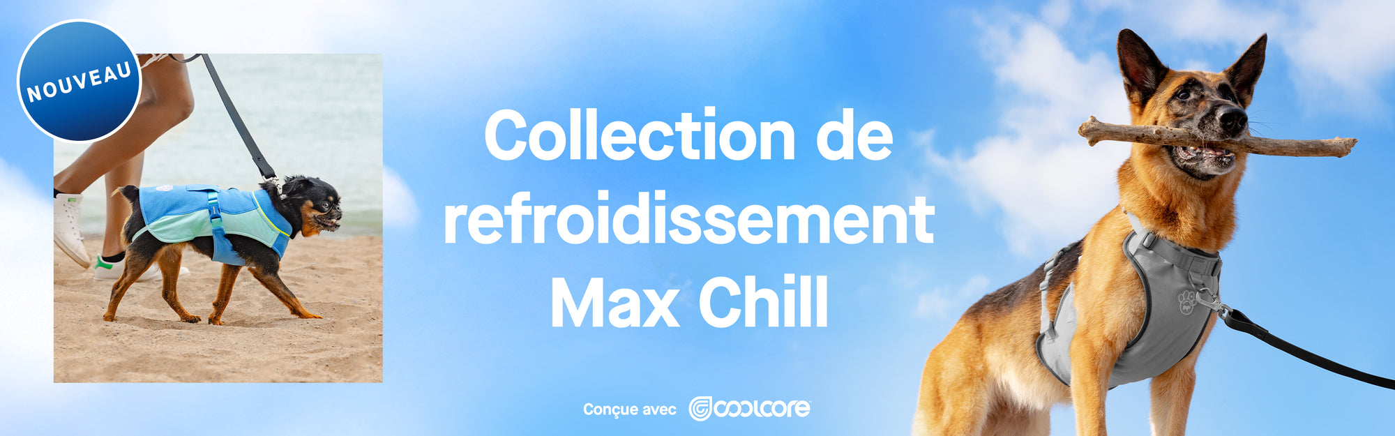 La technologie brevetée CoolcoreMD permet à nos produits Max Chill d’obtenir un effet de refroidissement par évaporation plus durable. La transpiration est le système de refroidissement naturel du corps. En s’évaporant, la sueur absorbe la chaleur du corps et de l’air, ce qui fait baisser la température. Lorsque vous ajoutez de l’eau au produit de refroidissement par évaporation de votre chien, elle imite la transpiration, ce qui absorbe la chaleur et abaisse la température de votre chien pour qu’il reste au frais et confortable.