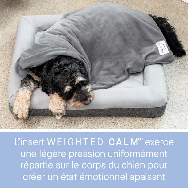 La collection Weighted Calm ™ est conçue pour aider à calmer les chiens anxieux. La collection comprend un gilet apaisant lesté, une couverture lestée pour chiens et un jouet apaisant pour chien qui applique une légère pression lestée pour aider à créer un état émotionnel plus calme.