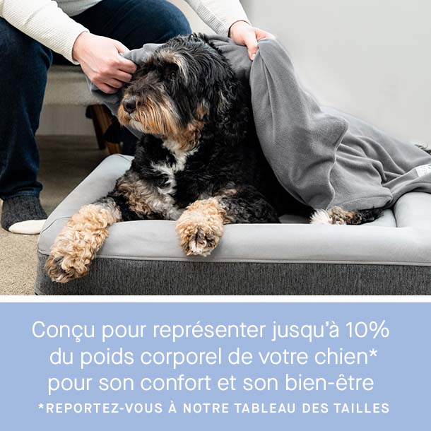 Si vous cherchez une couverture lestée pour votre chien, assurez-vous de trouver la taille qui lui convient. Pour acheter la couverture lestée apaisante de Canada Pooch, consultez notre guide des tailles pour trouver celle qui vous convient le mieux. Si votre chien est entre deux tailles, nous vous recommandons de choisir la taille inférieure. Veillez également à bien répartir le poids de la couverture sur son corps. Si votre chien se lève, retirez la couverture pour éviter que le poids ne s'accumule à un endroit précis.